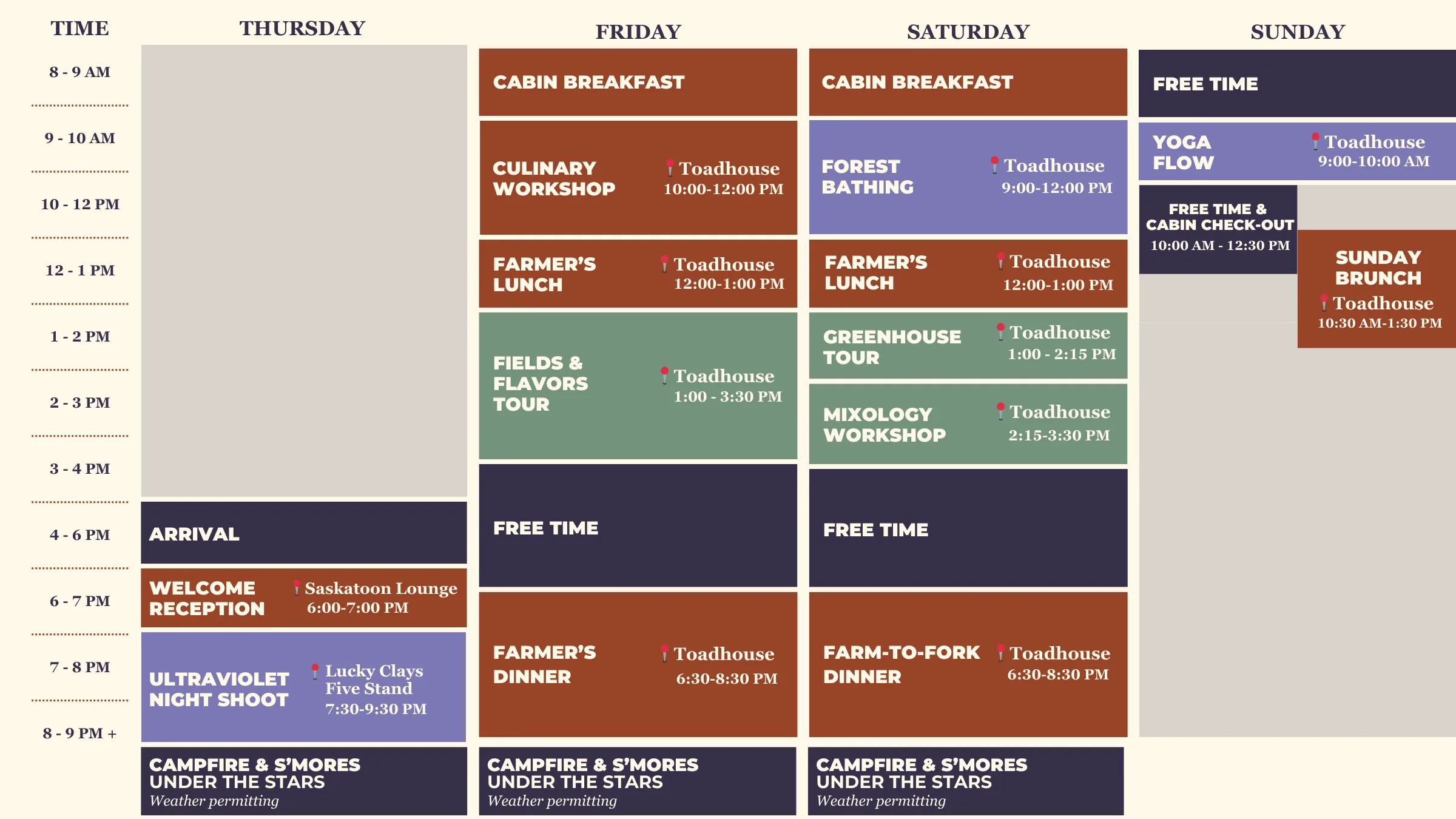 Whether you’re joining us for a 2-night* or 3-night stay, the weekend is yours to design. Feel free to join in the activities that excite you most, or simply relax and unwind on your own schedule.